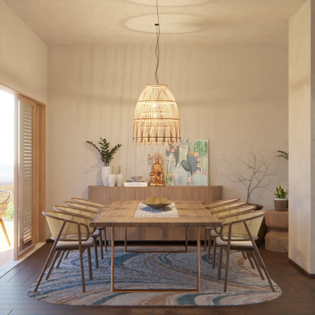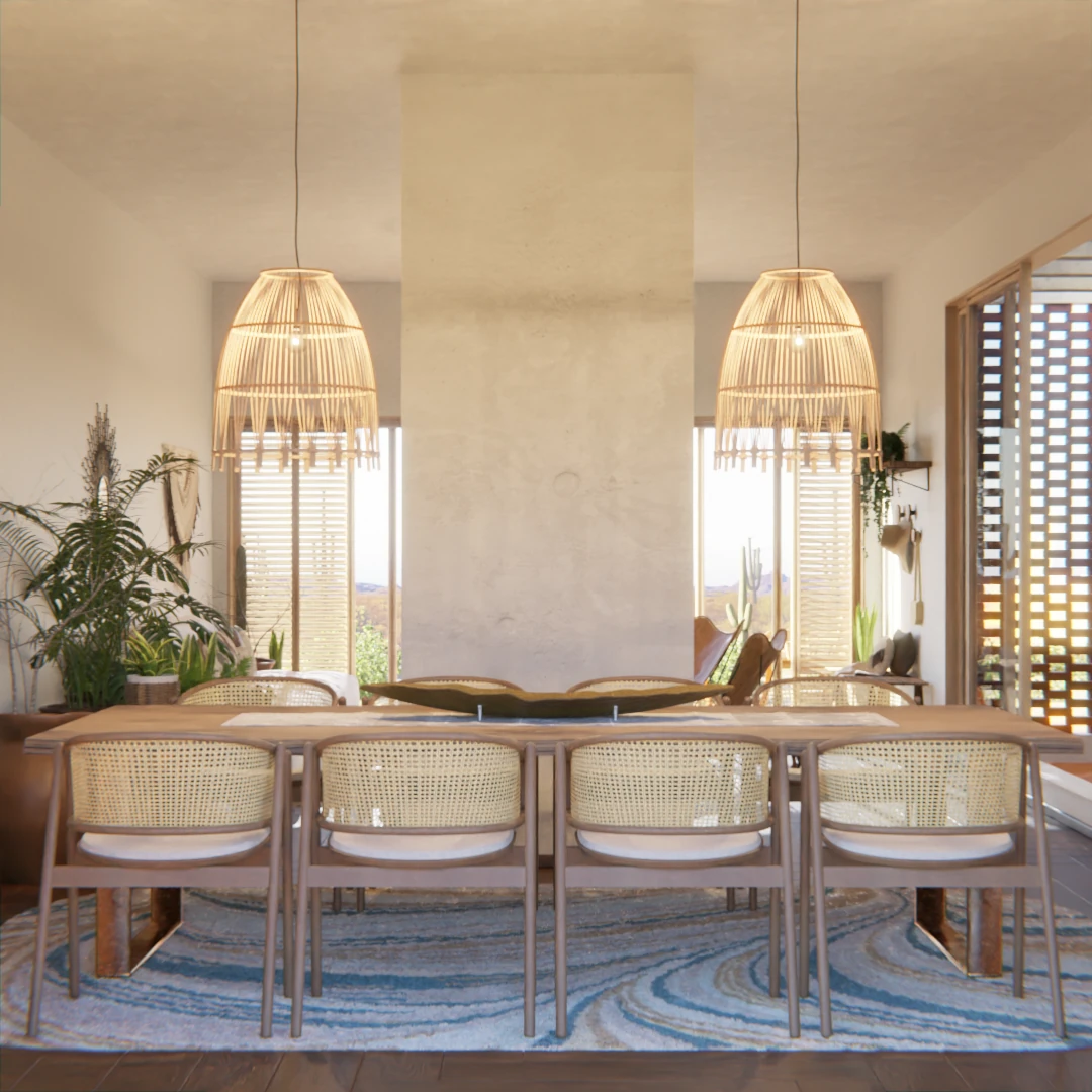 Na sala de jantar, mantivemos a unidade visual por meio da repetição de elementos — o tapete, as luminárias e as cadeiras com palhinha. Dessa forma, garantimos coerência estética, fluidez entre os ambientes e uma agradável sensação de amplitude.